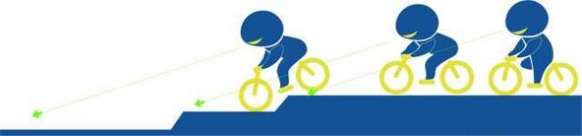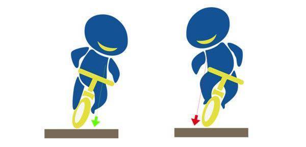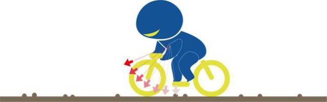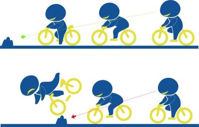 拉动刹车时,由你心脏-头的这条线会向前移-就像一根绑着纺锤的绳子。如果这条线投射到地面的点超过前轮的接地点,你的身体会被向前拉引接着发射出去。用力刹车就好比撞上一颗大石头-刹车力道太大会导致你的重心被向前抛,越过你能保持平衡的临界点。刹车跟撞击障碍物是相同的,你的重心必须保持在前轮接地点的后方