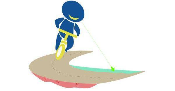 听起来再简单不过,但是大部分因为路线错误而导致的摔车都是起因于看着路径外的东西,向前注视着轮子该去的方向是重点。骑车时看着别的东西,头部的倾斜会导致你失去平衡,接着整个人会往那个方向偏移过去。所以不要理会不在路线上的东西,专注地向前看着你要走的路线。