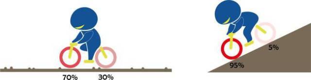 在平坦的路段骑乘时,前后刹车力道的配置应为前轮70%,后轮30%。但是紧急状况下,一旦刹车力道增强时,这个比例应该调整到前轮100%,后轮0%。