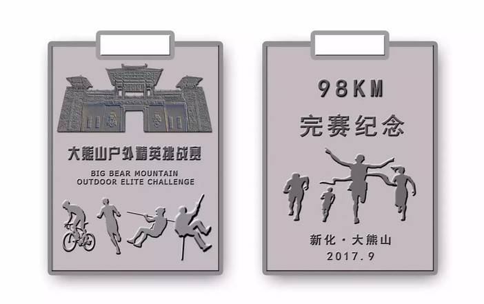 本次奖牌设计以长方形为基础造型,长80毫米,宽60毫米,正面大熊山国家森林公园标志性建筑蚩尤屋场以浮雕的形式呈现,配以“大熊山户外精英挑战赛”中英文字样,奖牌下方生动体现了4个项目的不同表现形式。背面以4人团队冲刺图案为主,辅以“完赛纪念”的字样,同时展现了本次比赛的竞赛里程和竞赛时间地点。整个奖牌设计中融合了历史建筑、运动等传统元素,在方寸之间将赛事的情怀、大熊山深厚的蚩尤文化底蕴完整展现。