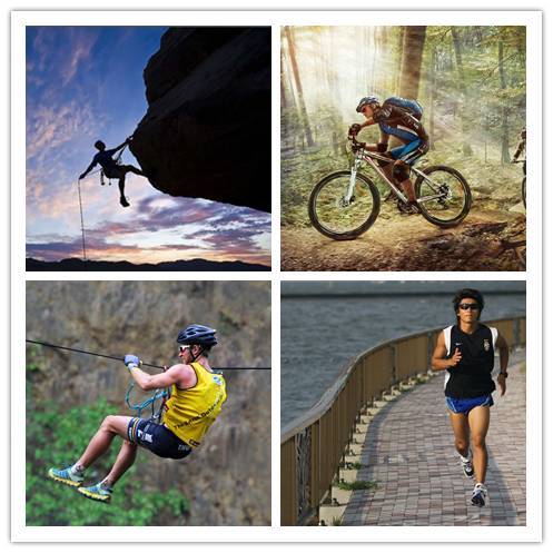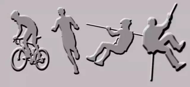 奖牌的正面的4个人物轮廓,是本次比赛的4个项目的不同表现形式,分别是自行车、越野跑、溜索(横渡)、楼降,展示了本次多项赛的丰富的比赛项目,非常的简洁直观。