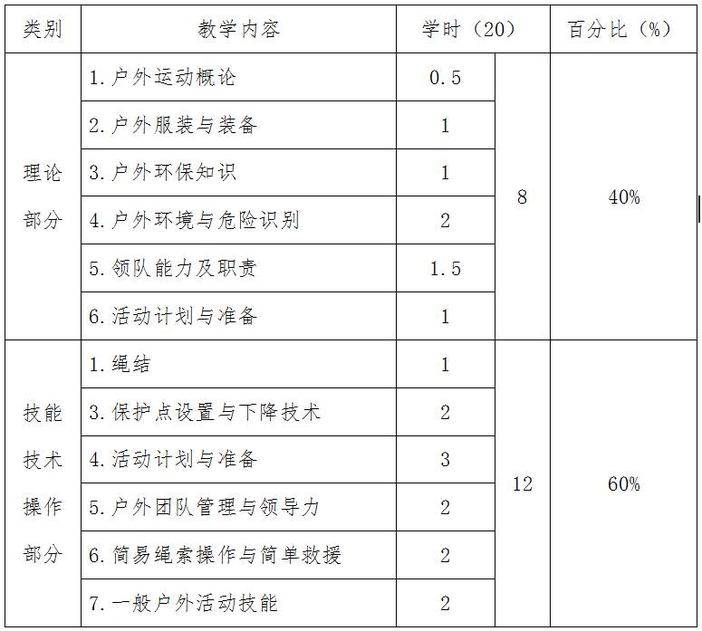 7、掌握户外活动的一般技能(如行走、建营);8、制定户外活动计划、并结合计划进行准备并实施;