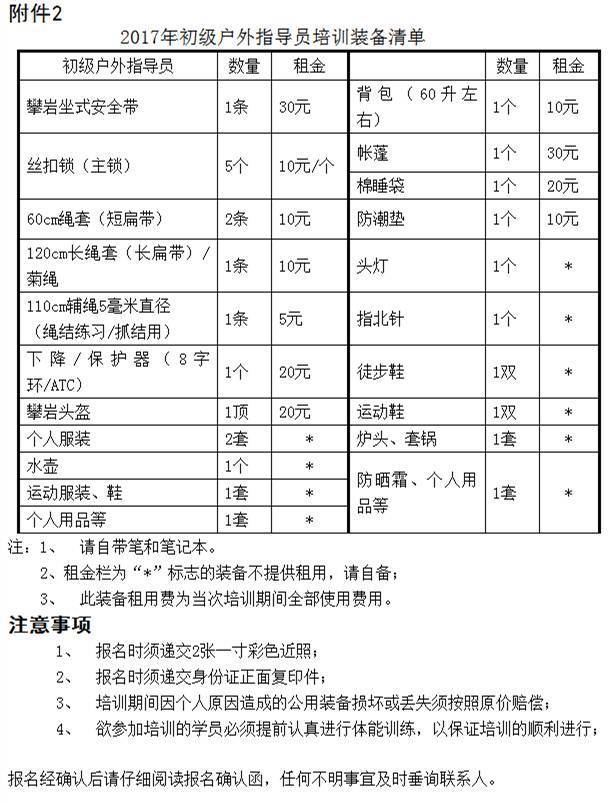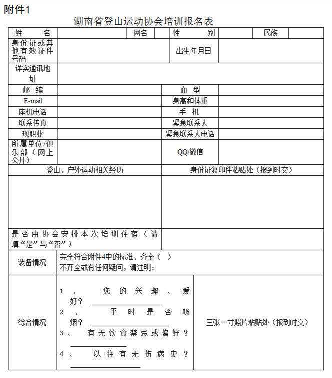 1、请于2017年11月5日前将报名表(见附件1)发送电子邮件至:湖南省登山运动协会培训部2496825858@qq.com。