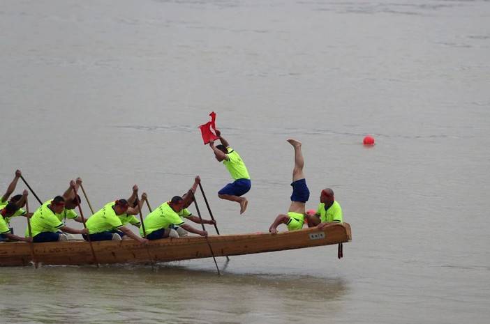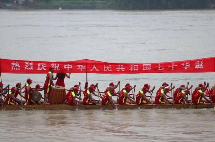 “棹影斡波飞万剑,鼓声劈浪鸣千雷。”暴雨下个不停,江面水流湍急。表演赛过后,48只龙舟举行竞速赛。扒船的汉子们赤膊上阵,在越来越激昂的鼓点中,龙舟如离弦之箭奔向600米赛道终点。两岸民众呐喊助威,喊哑了嗓子。最后,小江口1号、2号和莲花1队从48支队伍中脱颖而出,分别夺得表演赛和竞速赛冠军。