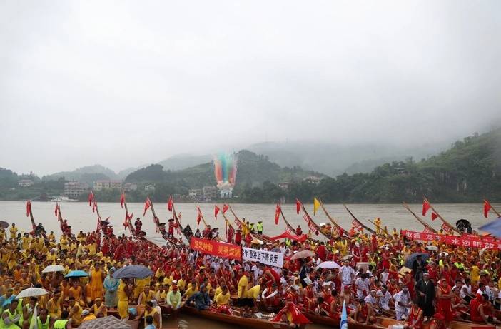 7点30分,大江口龙舟广场两岸已是人山人海,伞花朵朵。对岸青山如黛,云雾翻腾;江面龙舟云集,红黄蓝绿。水上特技表演搅起冲天白浪,一条江都兴奋起来了。