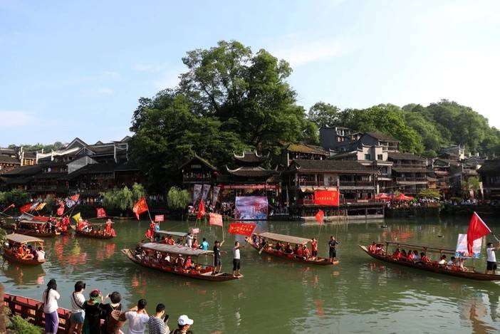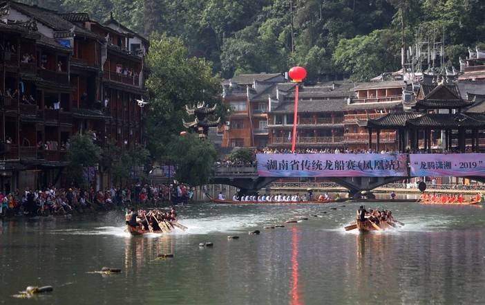 6月6日上午(农历五月初四),中国传统节日端午节到来之际,“龙腾潇湘·2019”湖南省传统龙船赛凤凰站暨2019年凤凰县“端午节”龙舟赛在中国最美小城——凤凰古城沱江河沙湾河段精彩上演,给来自海内外的各地游客及当地居民奉献了一道独具特色、原滋原味的民俗文化饕餮盛宴。